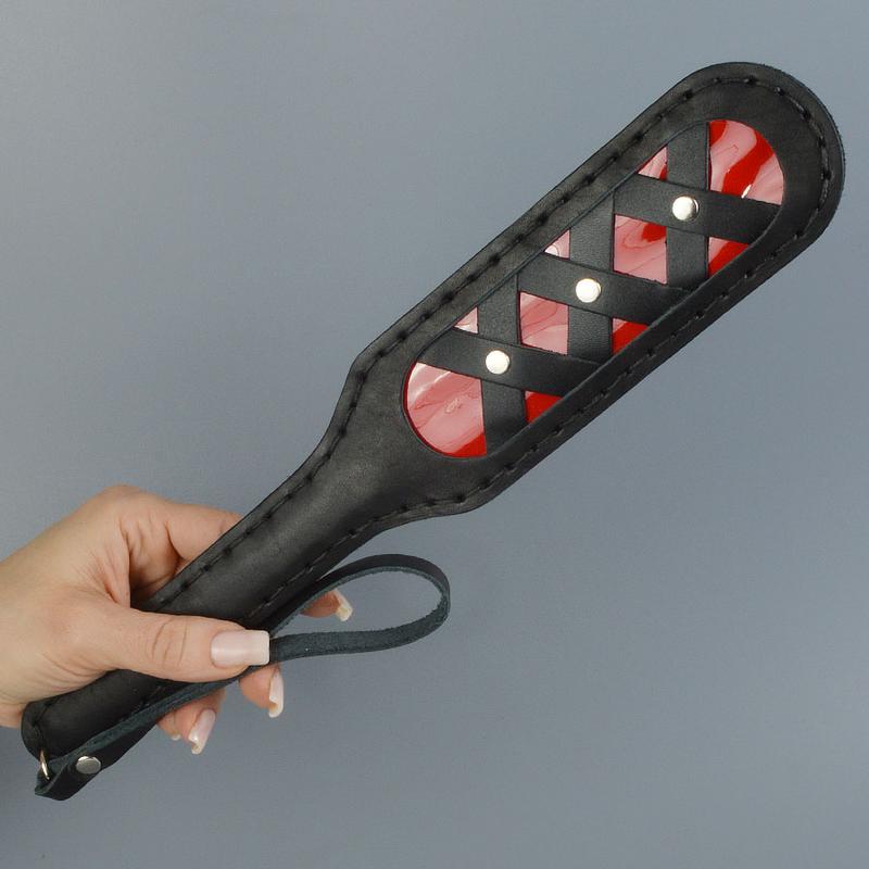 Шлепалка "Пятница" в черном цвете с лаковой красной вставкой — стильный аксессуар для ролевых игр и BDSM. Изготовлена из натуральной черной кожи премиум-класса, которая обеспечивает мягкость и долговечность. Лаковая красная вставка добавляет элегантный акцент, делая шлепалку визуально привлекательной и функциональной. Эргономичная форма с удобной ручкой гарантирует комфортное использование, а высококачественные материалы безопасны для кожи.