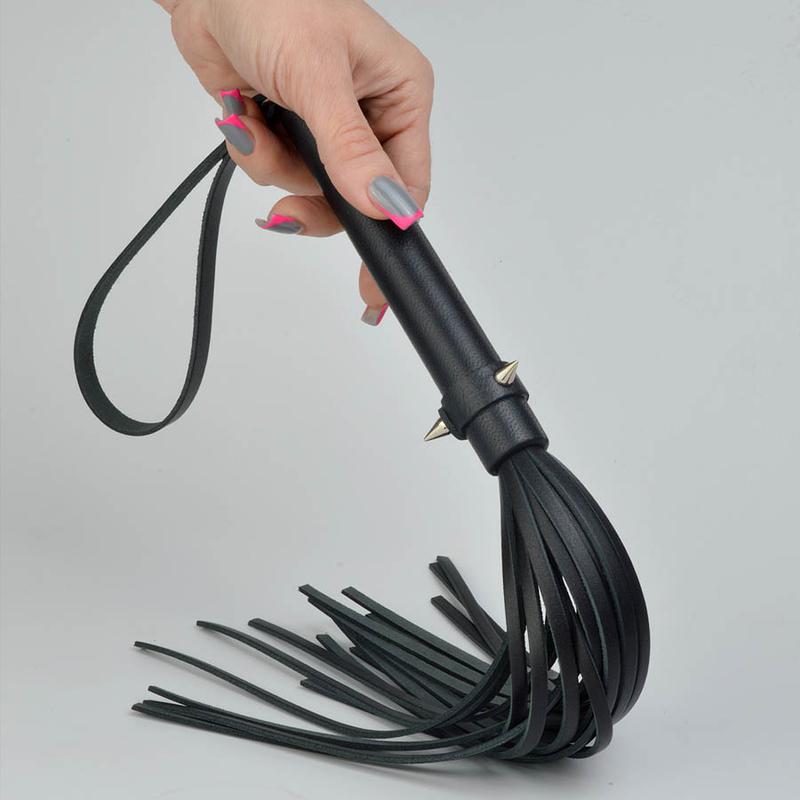Чёрная плеть из натуральной кожи — элегантный аксессуар для BDSM и ролевых игр, идеальный для добавления острых ощущений в интимные эксперименты. Рукоять обтянута натуральной кожей и украшена металлическими шипами для надёжной фиксации и стильного дизайна, длина рукояти — 15 см, обеспечивая комфортный хват.